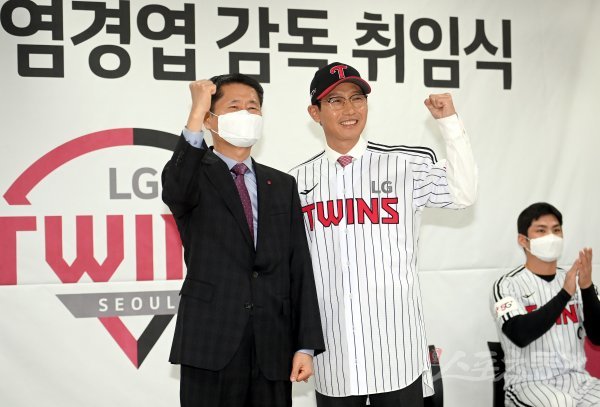 LG 트윈스 제14대 사령탑 염경엽 감독이 14일 서울 잠실야구장에서 진행된 취임식에서 김인석 LG 트윈스 대표와 기념촬영을 하고 있다.