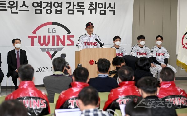 LG 트윈스 제14대 사령탑 염경엽 감독이 14일 서울 잠실야구장에서 진행된 취임식에서 소감을 말하고 있다.