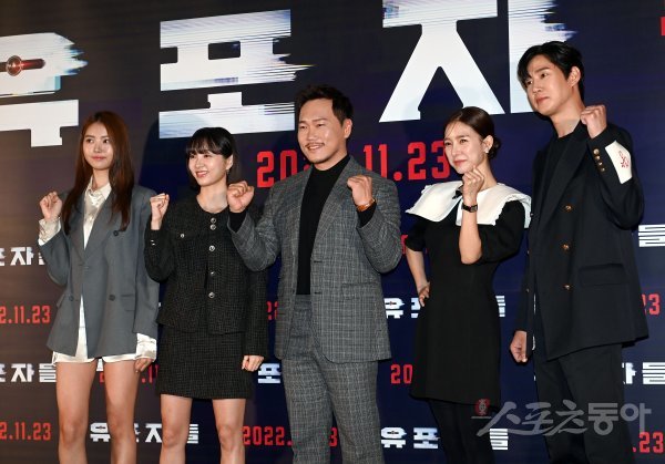 14일 서울 CGV용산에서 열린 영화 ‘유포자들’ 시사회에서 배우 임나영, 박주희, 송진우, 김소은, 박성훈이 포토타임을 갖고 있다.