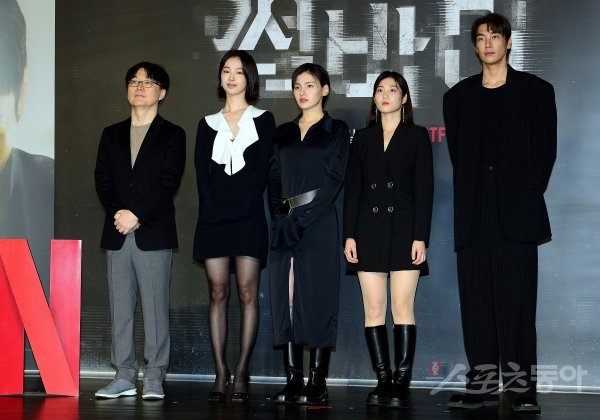 15일 서울 자양동 롯데시네마 건대입구점에서 넷플릭스 새 시리즈 ‘썸바디’ 제작발표회가 열렸다. 정지우 감독, 강해림, 김용지, 김수연, 김영광이 카메라를 향해 포즈를 취하고 있다.