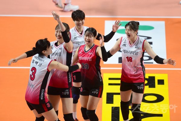 15일 서울 장충체육관에서 열린 ‘2022~2023 도드람 V-리그’ 여자부 GS칼텍스와 KGC인삼공사 경기에서 KGC인삼공사 박은진이 3세트 승리를 결정짓는 득점에 성공한 후 기뻐하고 있다.