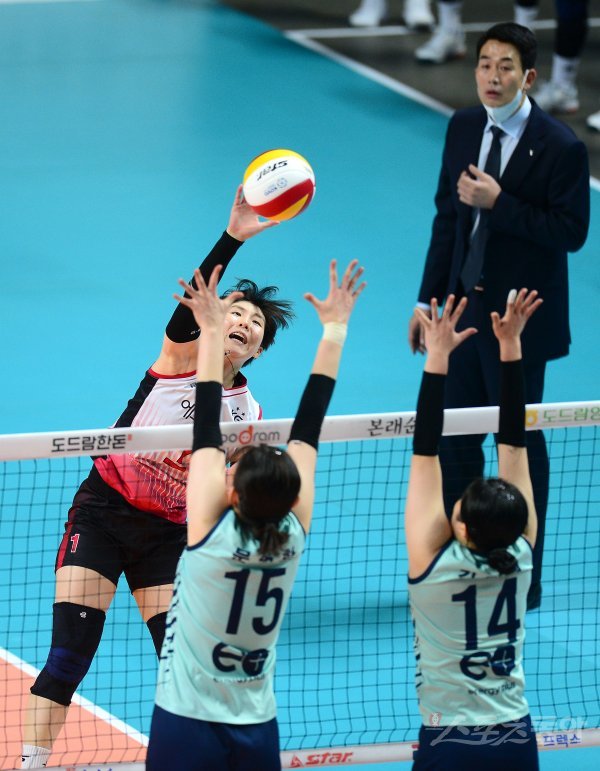15일 서울 장충체육관에서 열린 ‘2022~2023 도드람 V-리그’ 여자부 GS칼텍스와 KGC인삼공사 경기에서 KGC인삼공사 이소영이 GS탈텍스의 블로킹 사이로 스파이크를 날리고 있다.