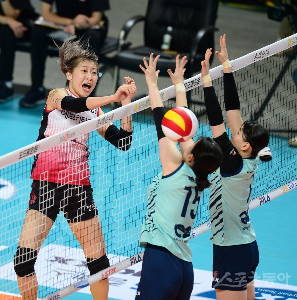 15일 서울 장충체육관에서 열린 ‘2022~2023 도드람 V-리그’ 여자부 GS칼텍스와 KGC인삼공사 경기에서 KGC인삼공사 박은진이 GS탈텍스의 블로킹 사이로 스파이크를 날리고 있다.