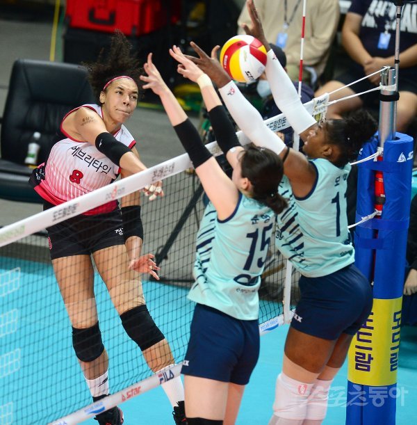 15일 서울 장충체육관에서 열린 ‘2022~2023 도드람 V-리그’ 여자부 GS칼텍스와 KGC인삼공사 경기에서 KGC인삼공사 엘리자벳이 GS탈텍스의 블로킹 사이로 스파이크를 날리고 있다.