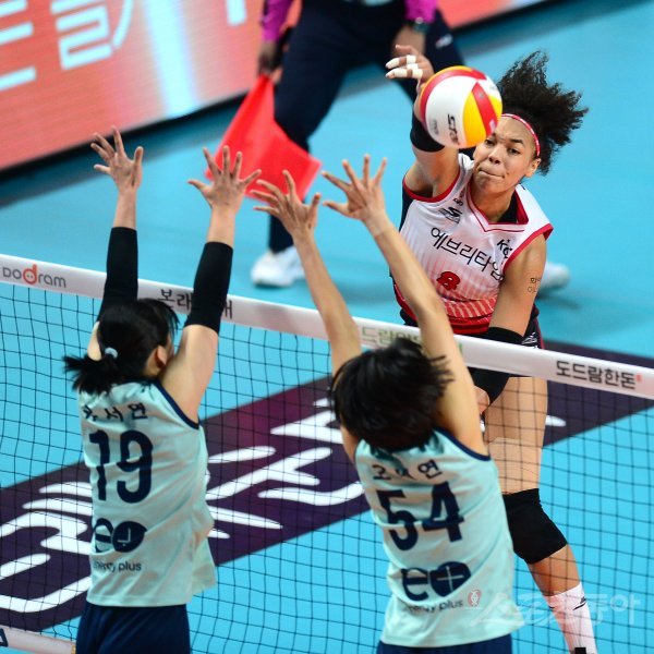 15일 서울 장충체육관에서 열린 ‘2022~2023 도드람 V-리그’ 여자부 GS칼텍스와 KGC인삼공사 경기에서 KGC인삼공사 엘리자벳이 GS탈텍스의 블로킹 사이로 스파이크를 날리고 있다.