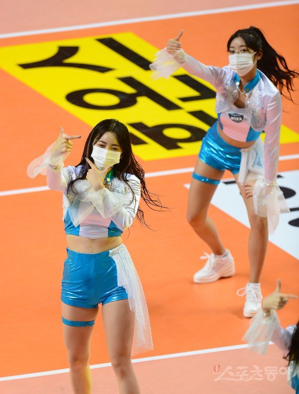 15일 서울 장충체육관에서 열린 ‘2022~2023 도드람 V-리그’ 여자부 GS칼텍스와 KGC인삼공사 경기에서 치어리더가 공연을 펼치고 있다.