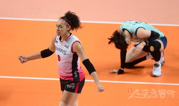 15일 서울 장충체육관에서 열린 ‘2022~2023 도드람 V-리그’ 여자부 GS칼텍스와 KGC인삼공사 경기에서 KGC인삼공사 엘리자벳이 공격 득점에 성공한 후 기뻐하고 있다.