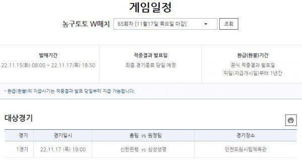 가장 먼저 마감되는 농구토토 W매치 65회차 게임은 17일(목) 오후 7시 인천도원체육관에서 열리는 신한은행-삼성생명전을 대상으로 하며, 경기 시작 10분 전인 17일(목) 오후 6시50분까지 참여가 가능하다.