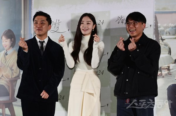 배우 곽민규, 한선화, 이상진 감독이 16일 서울 용산구 CGV용산아이파크몰점에서 열린 영화 ‘창밖은 겨울’ 언론시사회에서 포즈를 취하고 있다.