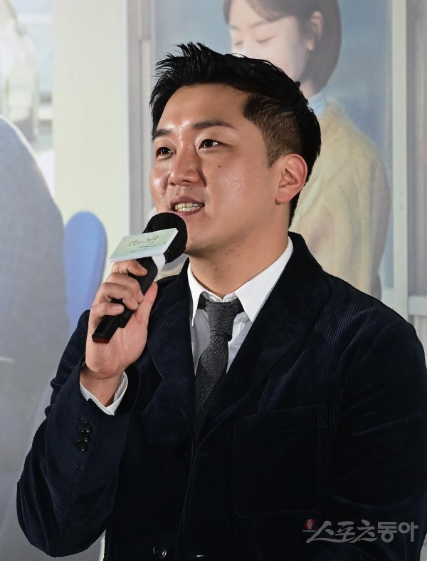 배우 곽민규가 16일 서울 용산구 CGV용산아이파크몰점에서 열린 영화 ‘창밖은 겨울’ 언론시사회에서 인사말을 하고 있다.
