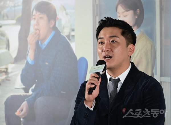 배우 곽민규가 16일 서울 용산구 CGV용산아이파크몰점에서 열린 영화 ‘창밖은 겨울’ 언론시사회에서 인사말을 하고 있다.