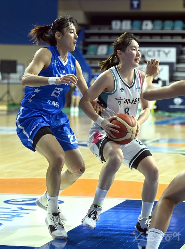 16일 아산이순신체육관에서 열린‘신한은행 SOL 2022~2023 여자프로농구‘ 우리은행과 하나원큐 경기에서 하나원큐 김지영이 우리은행 김단비의 수비를 뚫고 골밑을 공격하고 있다.
