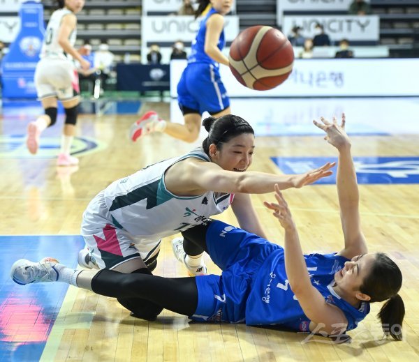 16일 아산이순신체육관에서 열린‘신한은행 SOL 2022~2023 여자프로농구‘ 우리은행과 하나원큐 경기에서 우리은행 박혜진이 하나원큐 양인영에 앞서 루즈볼을 잡아 넘어지며 패스하고 있다.