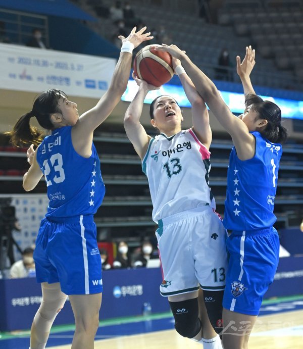16일 아산이순신체육관에서 열린‘신한은행 SOL 2022~2023 여자프로농구‘ 우리은행과 하나원큐 경기에서 하나원큐 양인영이 우리은행 수비를 뚫고 골밑 슛을 하고 있다.