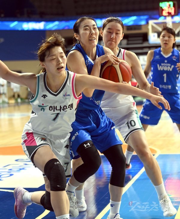 16일 아산이순신체육관에서 열린‘신한은행 SOL 2022~2023 여자프로농구‘ 우리은행과 하나원큐 경기에서 우리은행 박혜진이 리바운드 볼을 잡고 있다.
