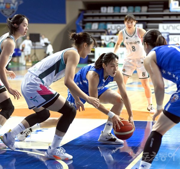 16일 아산이순신체육관에서 열린‘신한은행 SOL 2022~2023 여자프로농구‘ 우리은행과 하나원큐 경기에서 우리은행 김단비가 루즈볼을 잡고 있다.