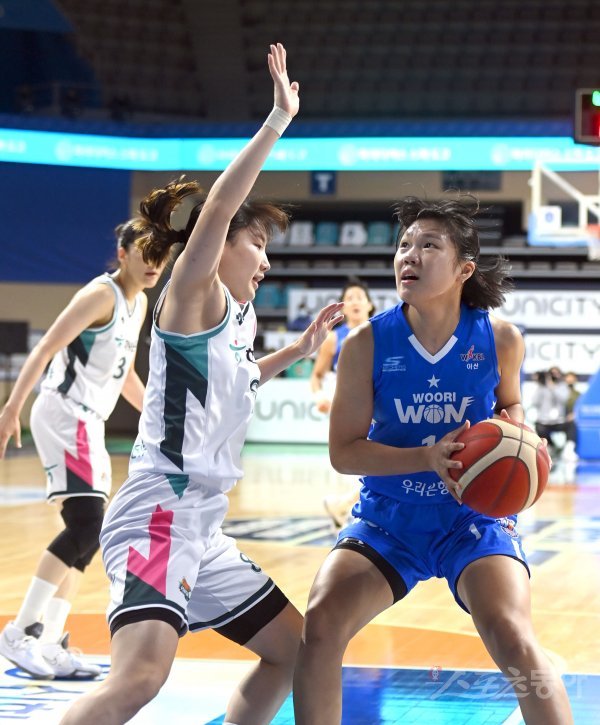 16일 아산이순신체육관에서 열린‘신한은행 SOL 2022~2023 여자프로농구‘ 우리은행과 하나원큐 경기에서 우리은행 박지현이 하나원큐의 수비를 뚫고 골밑을 공격하고 있다.