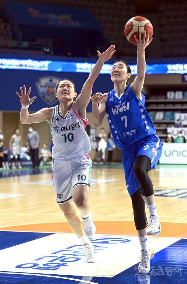 16일 아산이순신체육관에서 열린‘신한은행 SOL 2022~2023 여자프로농구‘ 우리은행과 하나원큐 경기에서 우리은행 박혜진이 하나원큐 김미연의 수비를 뚫고 골밑을 공격하고 있다.