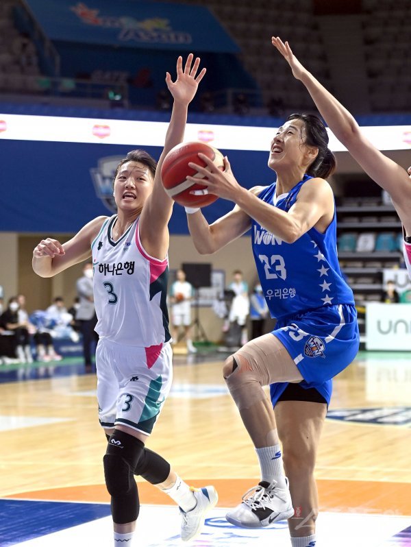 16일 아산이순신체육관에서 열린‘신한은행 SOL 2022~2023 여자프로농구‘ 우리은행과 하나원큐 경기에서 우리은행 김단비가 하나원큐의 수비를 뚫고 골밑을 공격하고 있다.