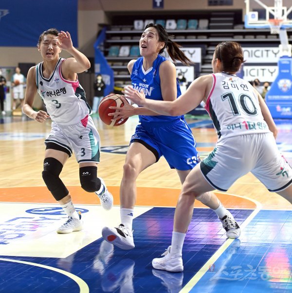 16일 아산이순신체육관에서 열린‘신한은행 SOL 2022~2023 여자프로농구‘ 우리은행과 하나원큐 경기에서 우리은행 김단비가 하나원큐의 수비를 뚫고 골밑을 공격하고 있다.