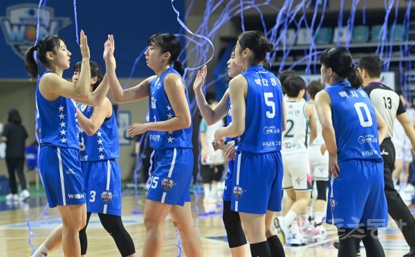 16일 아산이순신체육관에서 열린‘신한은행 SOL 2022~2023 여자프로농구‘ 우리은행과 하나원큐 경기에서 하나은행이 75-50으로 승리했다. 선수들이 하이파이브 하고 있다.