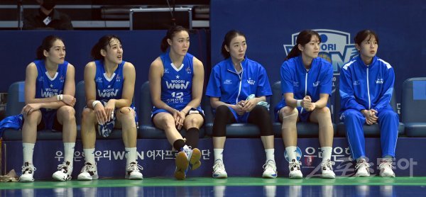 16일 아산이순신체육관에서 열린‘신한은행 SOL 2022~2023 여자프로농구‘ 우리은행과 하나원큐 경기에서 4쿼터 우리은행 주전 선수들이 벤치에 앉아 경기를 바라보고 있다.
