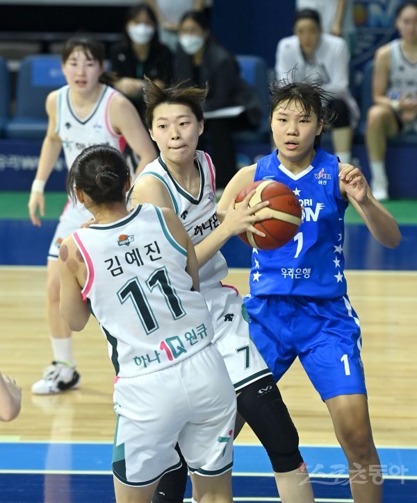 16일 아산이순신체육관에서 열린‘신한은행 SOL 2022~2023 여자프로농구‘ 우리은행과 하나원큐 경기에서 하나원큐 김하나가 리바운드 볼을 잡고 있다.