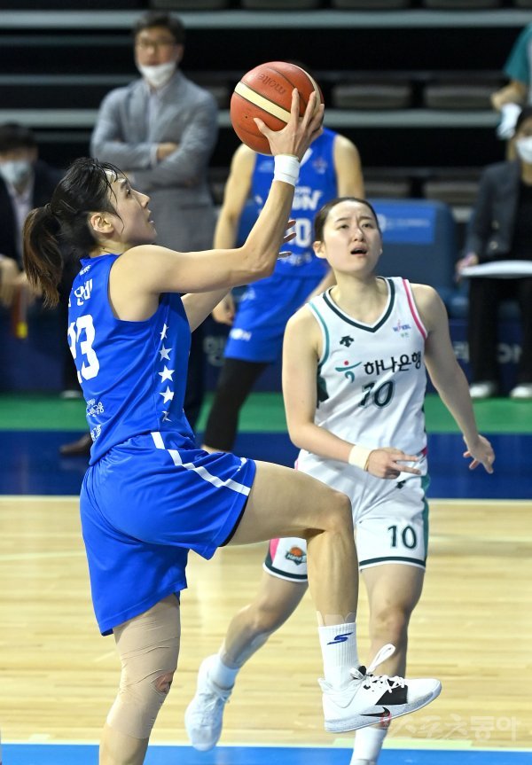 16일 아산이순신체육관에서 열린‘신한은행 SOL 2022~2023 여자프로농구‘ 우리은행과 하나원큐 경기에서 우리은행 김단비가 수비를 뚫고 골밑을 공격하고 있다.