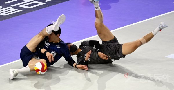 16일 인천 계양체육관에서 ‘2022-2023 도드람 V리그’ 인천 대한항공과 천안 현대캐피탈의 남자부 경기가 열렸다. 대한항공 정지석과 박지훈이 수비를 펼치다 충돌하고 있다.