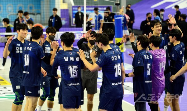 16일 인천 계양체육관에서 ‘2022-2023 도드람 V리그’ 인천 대한항공과 천안 현대캐피탈의 남자부 경기가 열렸다. 대한항공이 현대캐피탈을 상대로 세트스코어 3-0으로 승리한 후 선수들이 코트에서 기쁨을 나누고 있다.
