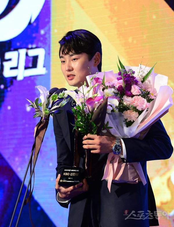 17일 오후 서울 중구 소공로 웨스틴 조선 서울에서 열린 ‘2022 신한은행 SOL KBO 시상식’에 참석한 두산 정철원이 신인상을 수상한 후 소감을 밝히고 있다.