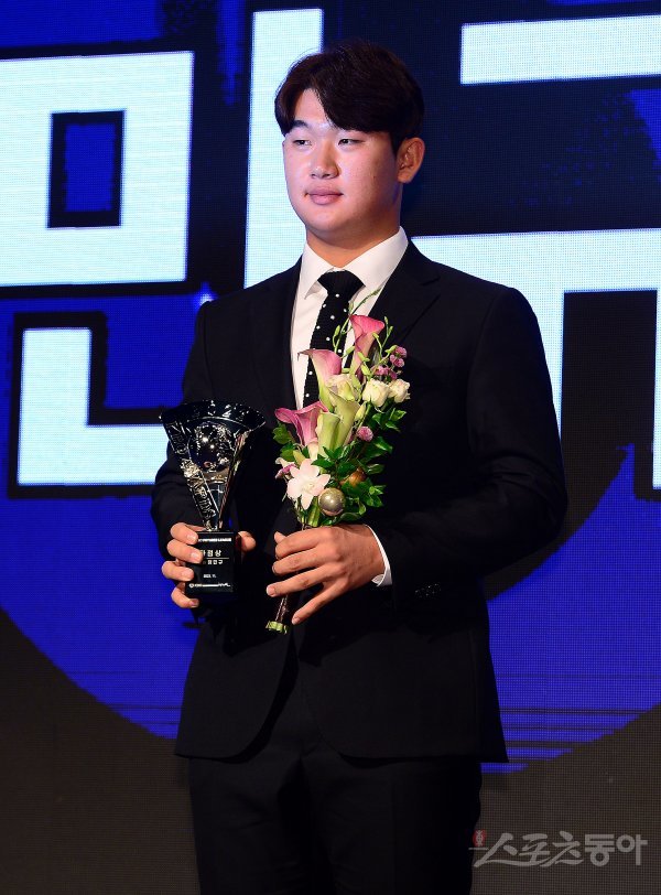 17일 오후 서울 중구 소공로 웨스틴 조선 서울에서 열린 ‘2022 신한은행 SOL KBO 시상식’에 참석한 한화 정민규가 퓨처스리그 북부리그 타점상을 수상한 후 기념촬영을 하고 있다.