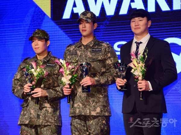 17일 오후 서울 중구 소공로 웨스틴 조선 서울에서 열린 ‘2022 신한은행 SOL KBO 시상식’에 참석한 상무 김민규, 이상영, SSG 이원준이 퓨처스리그 남부리그 승리상을 수상한 후 기념촬영을 하고 있다.