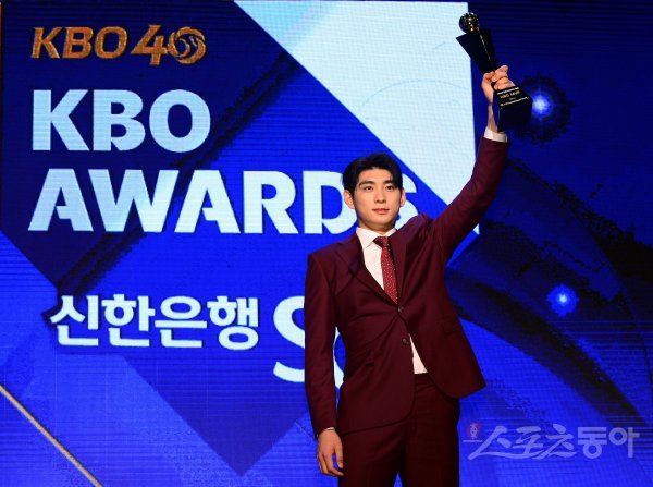17일 오후 서울 중구 소공로 웨스틴 조선 서울에서 열린 ‘2022 신한은행 SOL KBO 시상식’에 참석한 키움 이정후가 MVP를 수상한 후 기념촬영을 하고 있다.