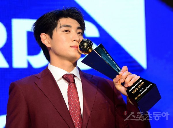 17일 오후 서울 중구 소공로 웨스틴 조선 서울에서 열린 ‘2022 신한은행 SOL KBO 시상식’에 참석한 키움 이정후가 MVP를 수상한 후 트로피에 키스를 하고 있다.