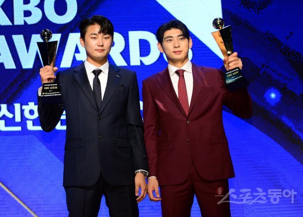 17일 오후 서울 중구 소공로 웨스틴 조선 서울에서 열린 ‘2022 신한은행 SOL KBO 시상식’에 참석한 신인상 정철원(두산)과 MVP 이정후(키움)가 기념촬영을 하고 있다.
