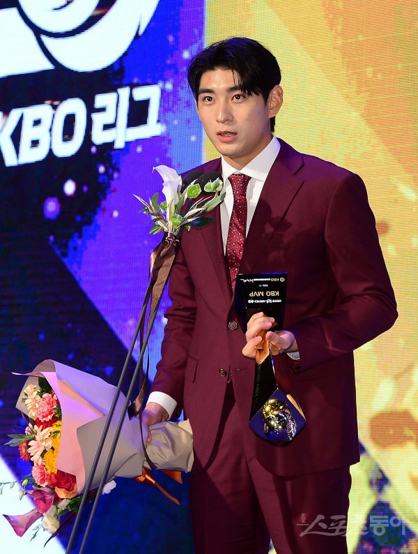 17일 오후 서울 중구 소공로 웨스틴 조선 서울에서 열린 ‘2022 신한은행 SOL KBO 시상식’에 참석한 키움 이정후가 MVP를 수상한 후 소감을 밝히고 있다.