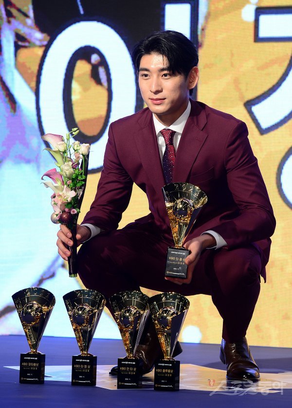 17일 오후 서울 중구 소공로 웨스틴 조선 서울에서 열린 ‘2022 신한은행 SOL KBO 시상식’에 참석한 키움 이정후가 타율상, 장타율상, 출루율상, 타점상, 안타상을 수상한 후 기념촬영을 하고 있다.