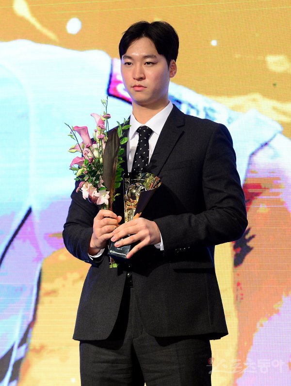 17일 오후 서울 중구 소공로 웨스틴 조선 서울에서 열린 ‘2022 신한은행 SOL KBO 시상식’에 참석한 kt 엄상백이 승률상을 수상한 후 기념촬영을 하고 있다.