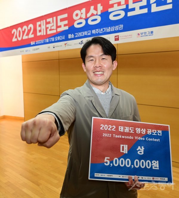 ‘2022 태권도 영상 공모전(한문화재단 주최, 스포츠동아 주관)’ 시상식이 17일 성북구 안암동 고려대학교 백주년기념삼성관에서 열렸다. 대상을 차지한 가온태권도 김광수씨가 기념 촬영을 하고 있다.
