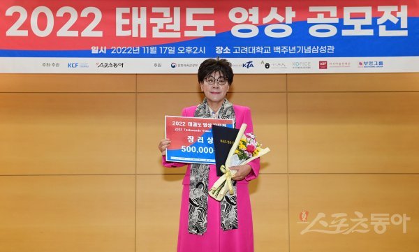 ‘2022 태권도 영상 공모전(한문화재단 주최, 스포츠동아 주관)’ 시상식이 17일 성북구 안암동 고려대학교 백주년기념삼성관에서 열렸다. 다이내믹 부문 장려상을 수상한 한국찌아찌아문화교류협회 태권도 호신술팀이 기념 촬영을 하고 있다.