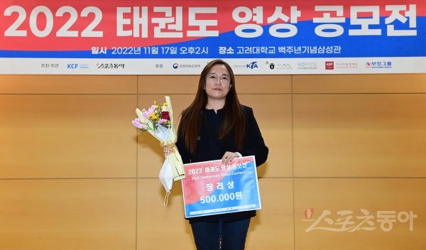 ‘2022 태권도 영상 공모전(한문화재단 주최, 스포츠동아 주관)’ 시상식이 17일 성북구 안암동 고려대학교 백주년기념삼성관에서 열렸다. K-Pop 태권댄스 부문 장려상을 수상한 믿음의 성북 태권도가 기념 촬영을 하고 있다.