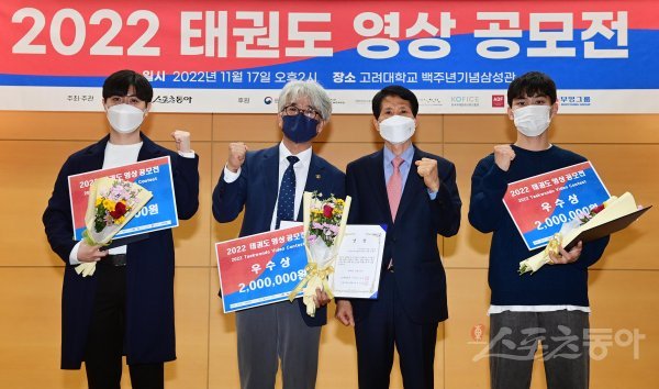 ‘2022 태권도 영상 공모전(한문화재단 주최, 스포츠동아 주관)’ 시상식이 17일 성북구 안암동 고려대학교 백주년기념삼성관에서 열렸다. K-Pop 태권댄스 부문 우수상 K-타이거즈 세종관 블랙, 다이내믹 부문 우수상 탄자니아 연합대 태권도사범 최규연, 강석재 세계태권도 연맹 전문위원, 다이내믹 부문 우수상 전주대 태권도 시범단이 기념 촬영을 하고 있다.