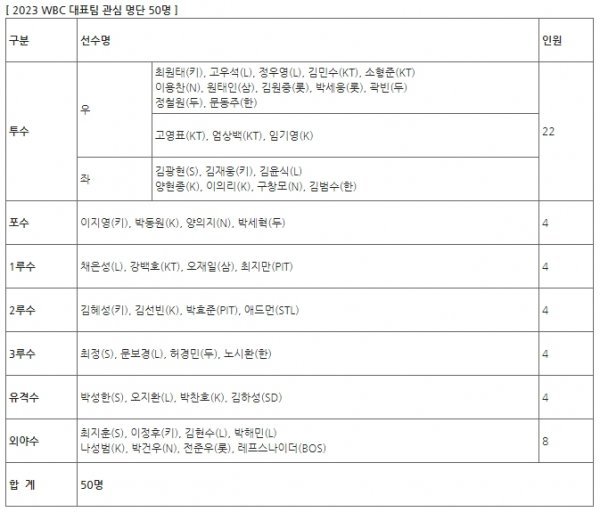 KBO는 18일 오는 2023년 3월에 열리는 WBC에 나설 야구대표팀 관심 명단 50명을 확정해 WBC 조직위원회인 WBCI에 제출했다고 전했다.