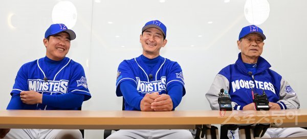 20일 서울 잠실야구장에서 열린 두산베어스 ‘곰들의 모임’ 환담회 및 최강야구와 연습 경기에 앞서 최강야구 정근우, 박용택, 김성근 감독이 답변 후 웃고 있다.