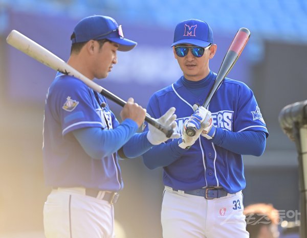 20일 서울 잠실야구장에서 열린 두산베어스 ‘곰들의 모임’ 환담회 및 최강야구와 연습 경기에 앞서 최강야구 이택근과 박용택이 이야기를 하고 있다.