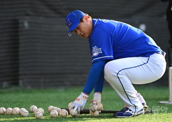 20일 서울 잠실야구장에서 열린 두산베어스 ‘곰들의 모임’ 환담회 및 최강야구와 연습 경기에 앞서 최강야구 이대호가 볼을 정리하고 있다.