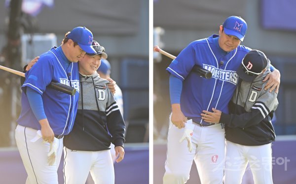 20일 서울 잠실야구장에서 열린 두산베어스 ‘곰들의 모임’ 환담회 및 최강야구와 연습 경기에 앞서 최강야구 이대호와 두산 정수성 코치가 인사하고 있다.