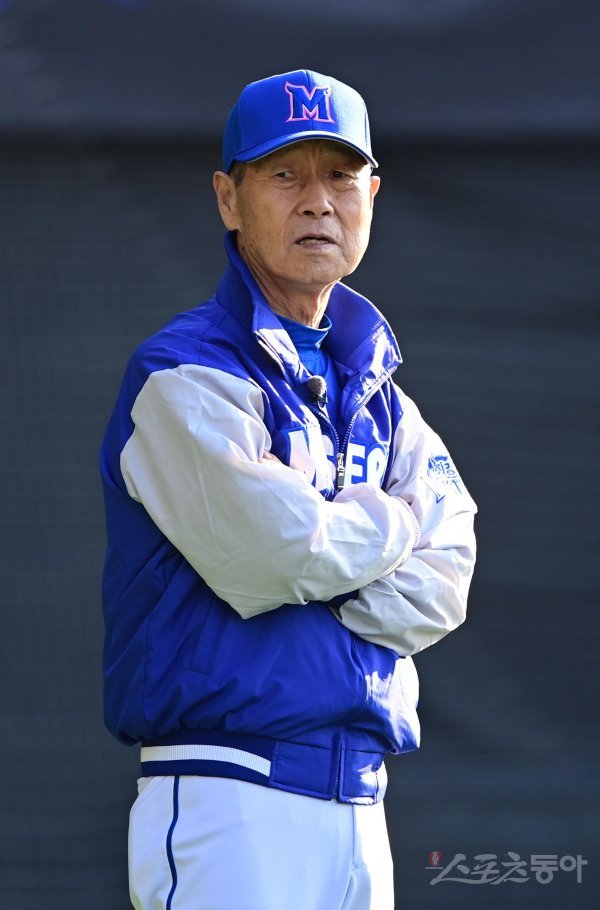 20일 서울 잠실야구장에서 열린 두산베어스 ‘곰들의 모임’ 환담회 및 최강야구와 연습 경기에 앞서 최강야구 김성근 감독이 선수들의 훈련을 지켜보고 있다.