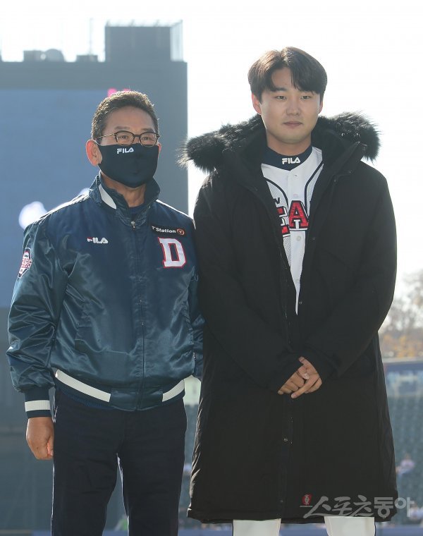20일 서울 잠실야구장에서 열린 두산베어스 ‘곰들의 모임’ 환담회 및 최강야구와 연습 경기에 앞서 베사모 시상식에서 두산 정철원이 허슬 플레이어상을 수상해 전풍 사장과 기념 촬영을 하고 있다.